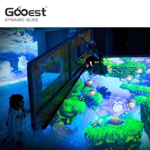 e) La diapositive interactive est une diapositive traditionnelle combinée avec un équipement de projection et des programmes informatiques, pour ajouter une expérience plus interactive. Lorsque les enfants glissent sur le toboggan, ils interagiront avec les formes ci-dessus ou tomberont dans l’eau ou des feuilles éparpillées.