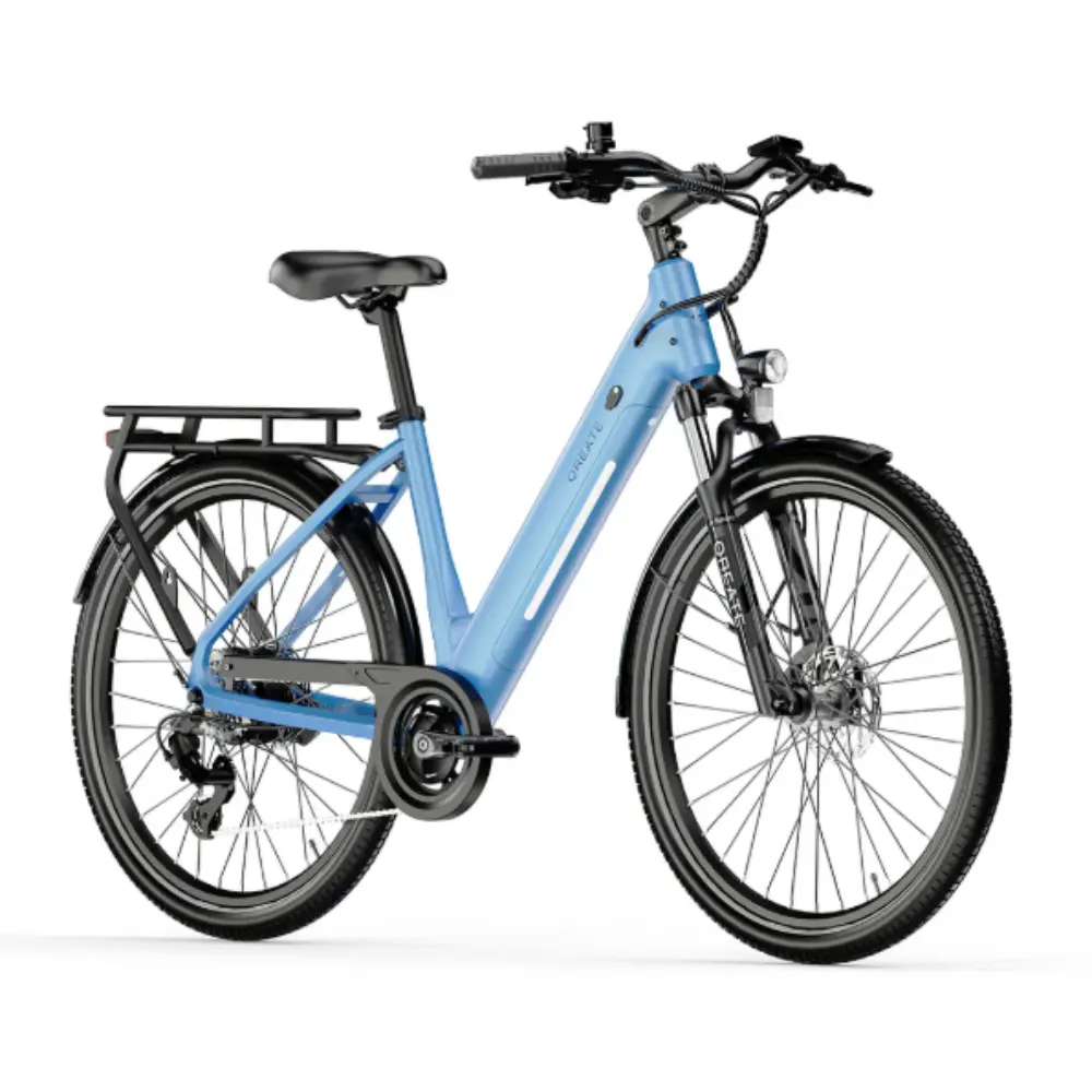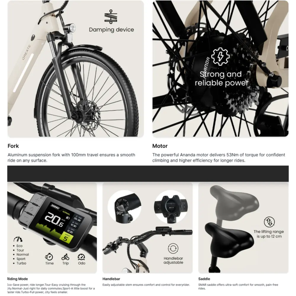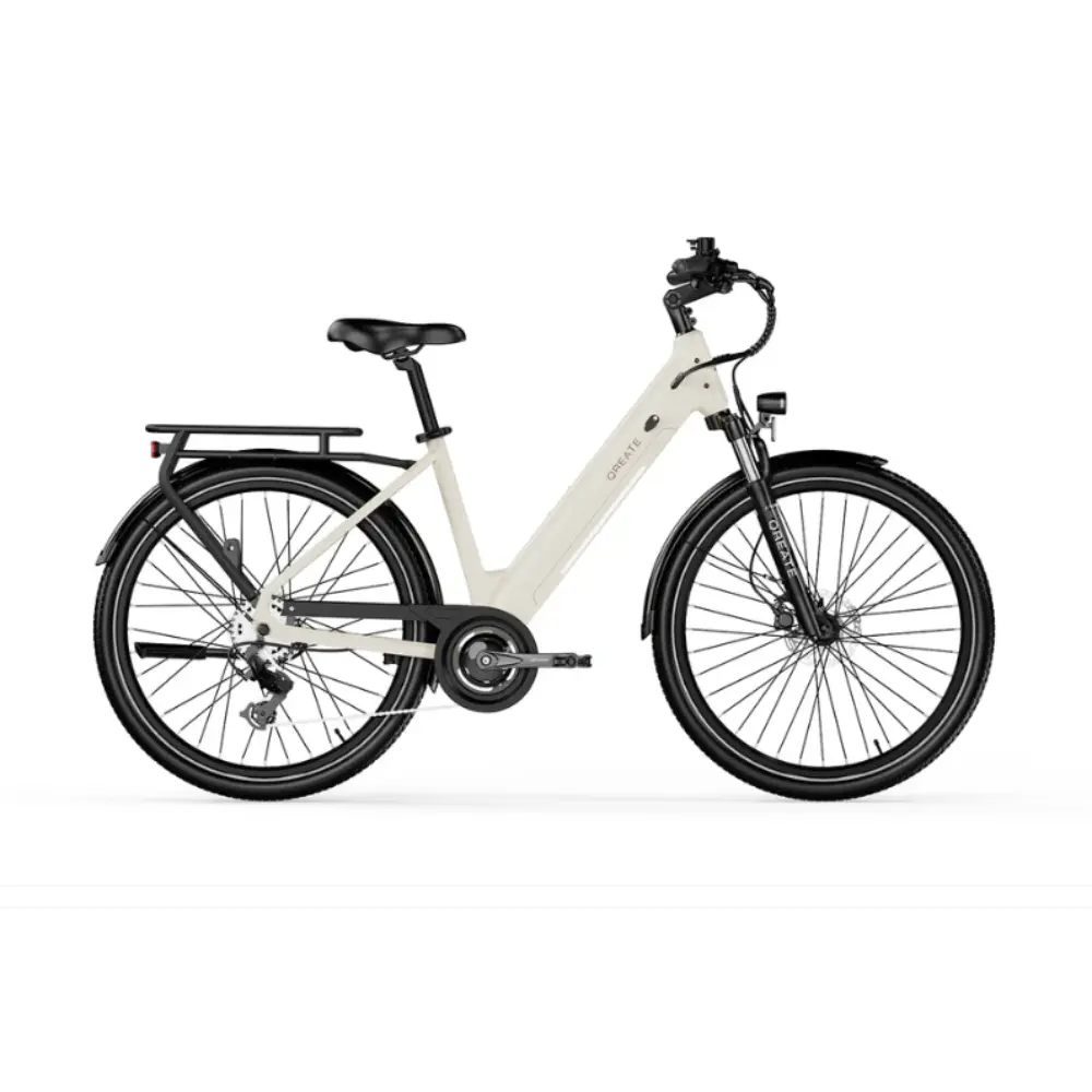 Le A-Spadz QREATE City Air Vélo Électrique est un modèle haute performance conçu pour le confort, l’efficacité et les déplacements urbains intelligents. Il allie un design élégant à une conception robuste pour offrir une expérience de conduite optimale aux citadins. Équipé d’un moteur 36 V 250 W, il atteint une vitesse maximale de 25 km/h et offre une autonomie impressionnante allant jusqu’à 90 km grâce à sa batterie lithium 36 V 13,6 Ah (486 Wh). Ce vélo est équipé d’un écran TFT couleur de 2,4 pouces monté sur le côté, affichant cinq niveaux de vitesse, des données de conduite en temps réel et une connectivité NFC/Bluetooth. Le confort est au rendez-vous grâce à une fourche à suspension EXSHO à huile et ressort, des garde-boues en résine renforcée et une potence facilement réglable pour s’adapter à toutes les tailles. Le cadre bénéficie d’un triple traitement de surface par pulvérisation et revêtement pour une durabilité accrue et une finition sans poussière. Que vous circuliez en ville ou empruntiez des pistes cyclables pittoresques, le QREATE City Air redéfinit le cyclisme intelligent, élégant et durable.