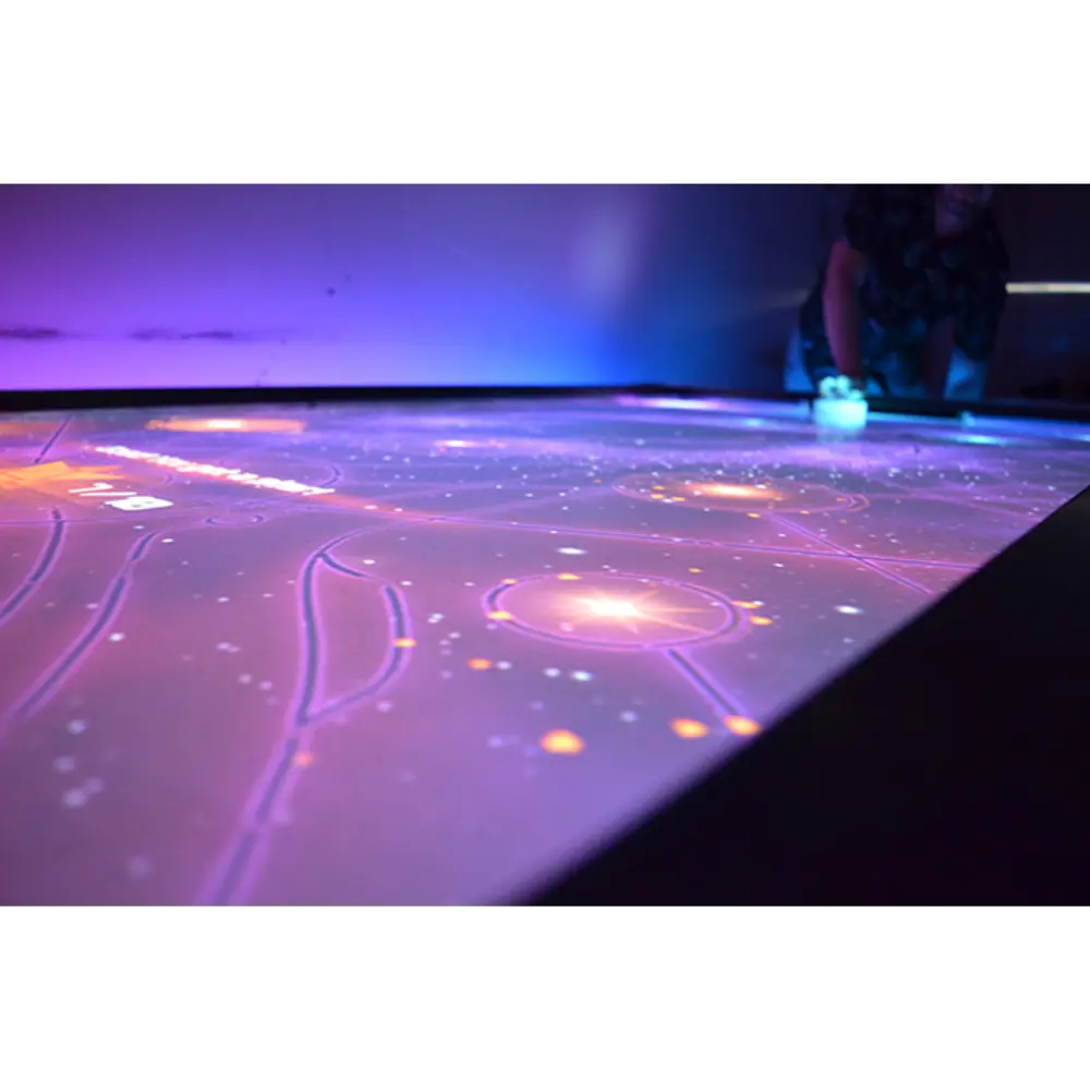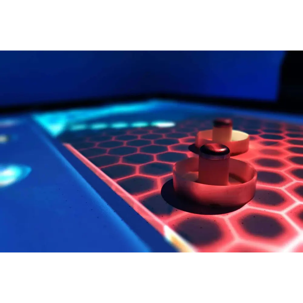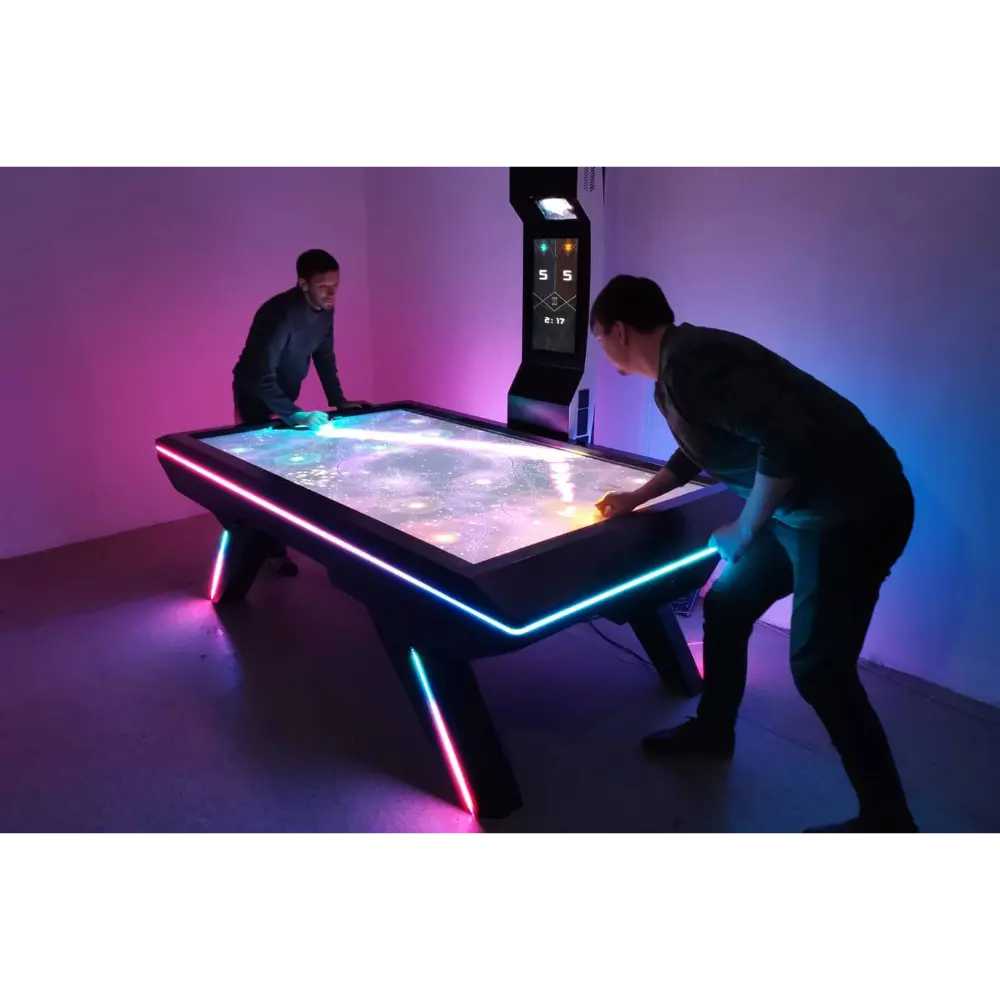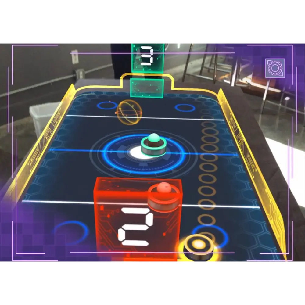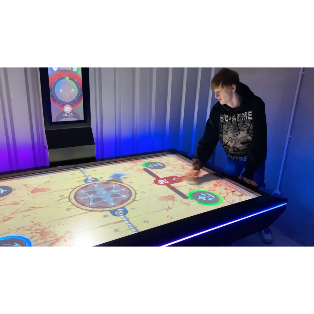 - Interaction : véritable palet et maillets avec effets numériques projetés sur la table