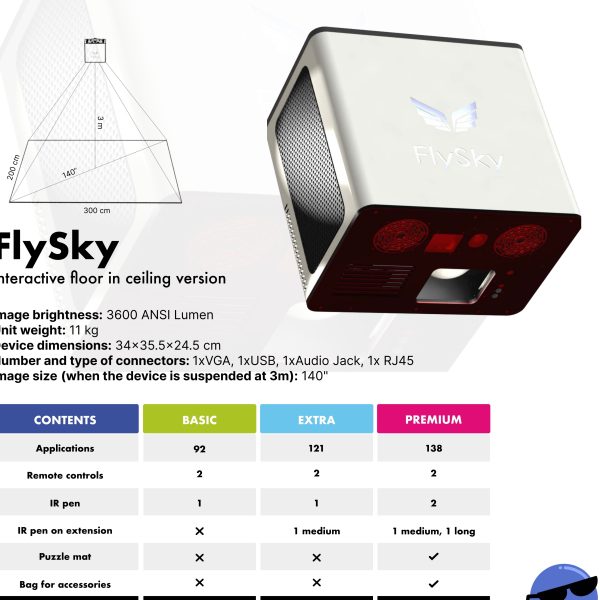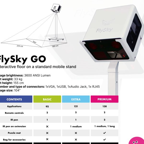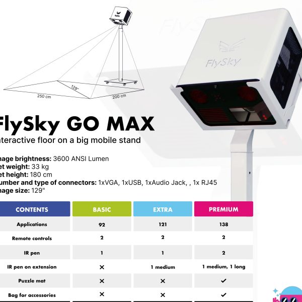 Le FlySky Sol Interactif est un outil polyvalent d’éducation, de formation et de thérapie. Il offre une expérience d’apprentissage engageante et interactive grâce à son sol interactif, qui peut être utilisé pour divers jeux et applications éducatifs. Il propose une variété de jeux éducatifs qui s’adressent à différentes matières et styles d’apprentissage : jeux de mathématiques, jeux de langage, activités scientifiques et STEAM, quiz et anecdotes, jeux d’activité physique, jeux créatifs et artistiques, jeux de résolution de problèmes et de logique. Il utilise tous les sens pour rendre l’apprentissage, la formation et la thérapie inoubliables et amusants, en améliorant la curiosité cognitive et la pensée logique. C’est un outil polyvalent qui peut être utilisé comme sol et table interactifs, ce qui le rend adaptable à différents environnements et besoins. Il soutient les enfants ayant des besoins éducatifs spéciaux en offrant un environnement de travail approprié et attrayant, qui peut être modifié pour atteindre des objectifs thérapeutiques. FlySky élimine les retards dans l’interaction de l’utilisateur, s’adapte aux changements d’éclairage de la pièce et reconnaît et élimine les ombres, garantissant une qualité d’image et une expérience utilisateur optimales. La version FlySky GO offre une mobilité, lui permettant d’être facilement déplacé entre les salles de classe ou différents emplacements sans avoir besoin d’une installation permanente. La version FlySky GO offre une mobilité, lui permettant d’être facilement déplacé entre les salles de classe ou différents emplacements sans nécessiter d’installation permanente.