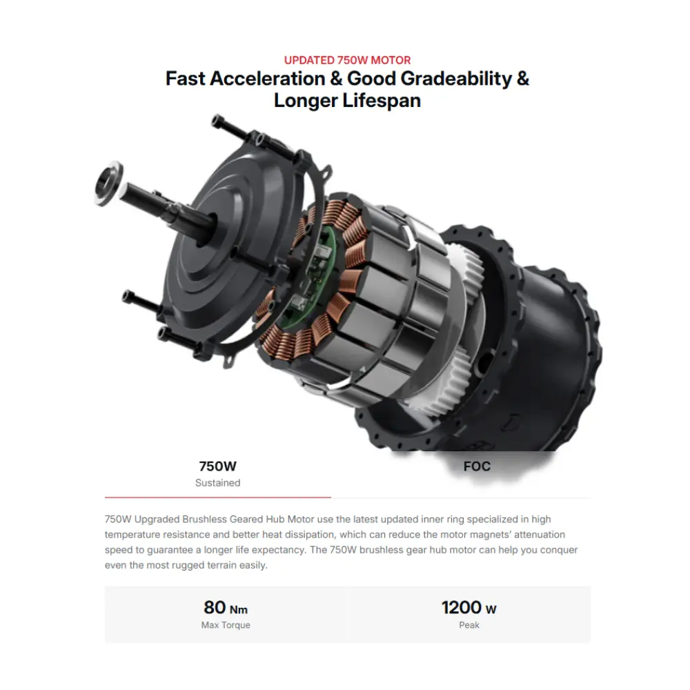 - Moteur : Moteur à moyeu à engrenages de 750 W