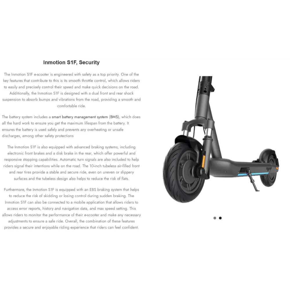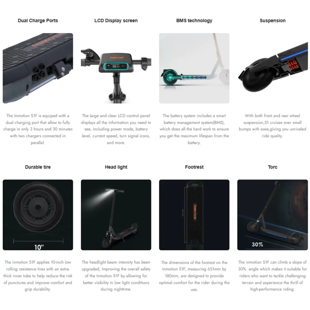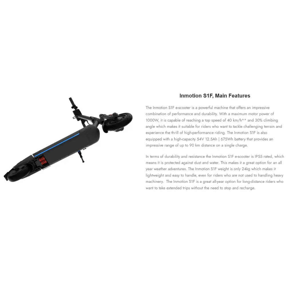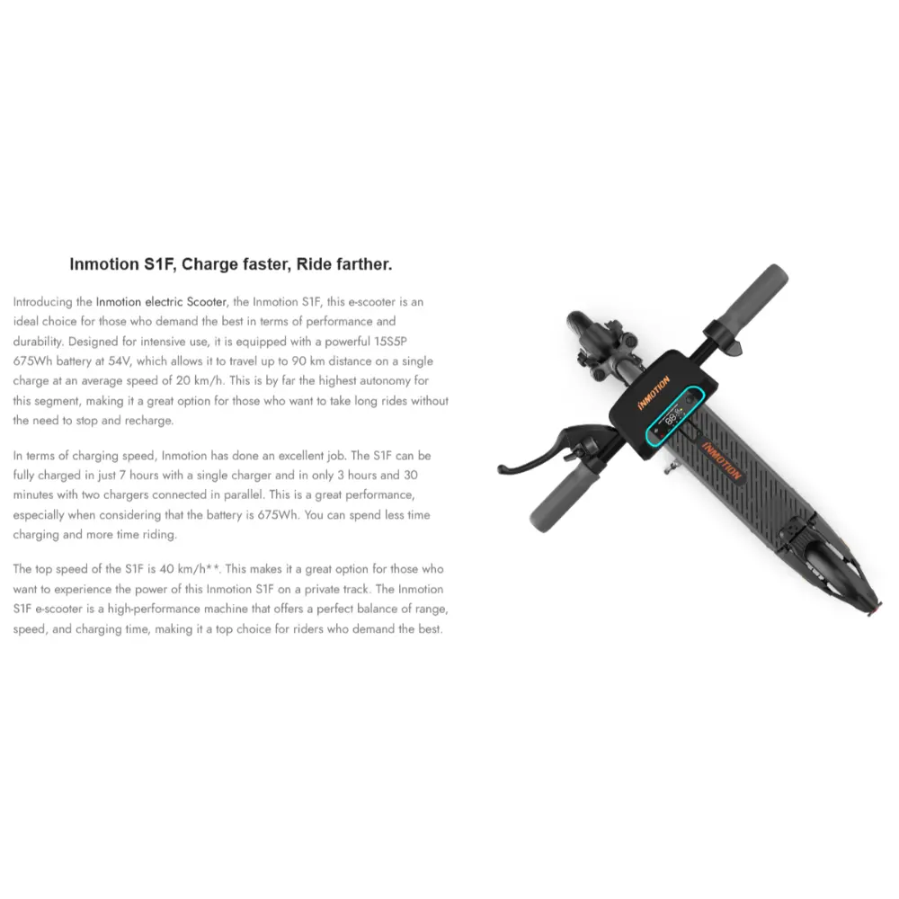 La Inmotion S1F Trottinette Électrique est un modèle performant conçu pour les trajets domicile-travail, offrant autonomie, confort et robustesse. Figurant parmi les modèles les plus polyvalents de sa catégorie, elle propose une autonomie maximale de 95 km sur une seule charge grâce à sa batterie lithium-ion de 675 Wh. Son moteur de 500 W (jusqu’à 1 000 W en crête) lui permet d’atteindre une vitesse de 40 km/h et de gravir des pentes jusqu’à 30 %. Elle est ainsi adaptée aussi bien aux trajets urbains plats qu’aux terrains vallonnés. Le confort est un atout majeur : équipée de doubles suspensions avant et arrière et de pneus pneumatiques de 10 pouces, elle garantit une conduite souple même sur les surfaces irrégulières. La sécurité est renforcée par un frein à tambour arrière associé au freinage régénératif, tandis que les phares et feux arrière puissants améliorent la visibilité par faible luminosité. La trottinette supporte une charge utile jusqu’à 140 kg, ce qui la rend idéale pour les personnes de forte corpulence. La praticité est également au cœur de sa conception. La S1F propose trois modes de conduite, un tableau de bord intelligent et une application pour le suivi des performances. Son indice de protection IP54 la protège des projections d’eau, et son mécanisme de pliage rapide facilite son transport. La charge complète prend environ 7 heures avec un chargeur standard, ou seulement 3,5 heures avec un chargeur double. L’Inmotion S1F allie grande autonomie, robustesse et fonctionnalités intelligentes, ce qui en fait un choix fiable pour les trajets quotidiens et les balades de loisirs.