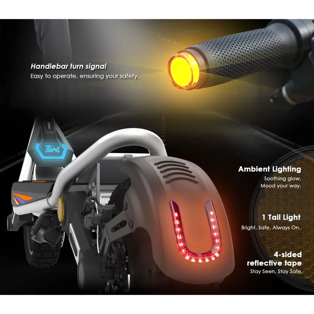 - Éclairage : autocollants latéraux ambiants, éclairage avant et réflecteurs pour une visibilité nocturne