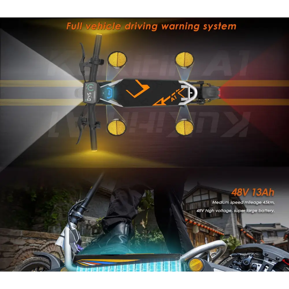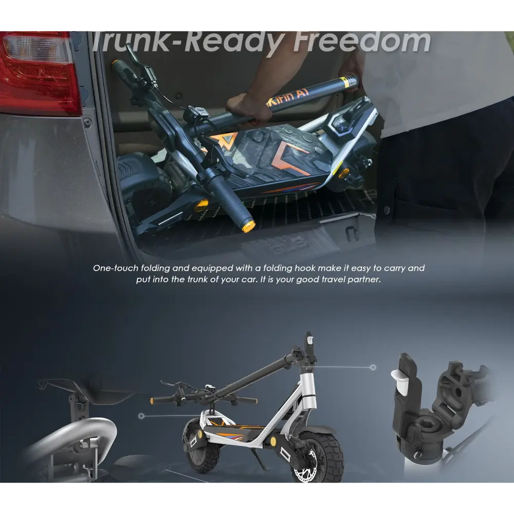 La KuKirin A1 Trottinette Électrique est une trottinette électrique élégante et puissante, conçue pour les trajets urbains et les aventures du week-end. Dotée d’un moteur sans balais de 800 W, elle atteint une vitesse de pointe de 45 km/h, ce qui en fait l’un des modèles les plus rapides de sa catégorie. Alimentée par une batterie lithium robuste de 48 V et 13 Ah, elle offre une autonomie allant jusqu’à 45 kilomètres sur une seule charge, idéale pour les trajets de moyenne distance. Ses pneus sans chambre à air de 10 pouces offrent une excellente adhérence et une excellente stabilité sur divers terrains, notamment l’asphalte, le gravier et les pavés. Elle est équipée de freins à double disque et d’un système de freinage à coupure d’alimentation, garantissant un freinage réactif et sûr, même à grande vitesse. Pour plus de confort, elle est équipée d’amortisseurs avant et arrière qui amortissent les bosses. La KuKirin A1 est également dotée d’un écran LCD intelligent qui affiche la vitesse, le niveau de batterie et le mode de conduite. Avec son cadre pliable, son éclairage d’ambiance et son design aérodynamique moderne, elle est à la fois pratique et élégante. Que vous naviguiez dans les rues de la ville ou que vous vous promeniez dans les parcs, la KuKirin A1 offre une conduite dynamique et agréable.