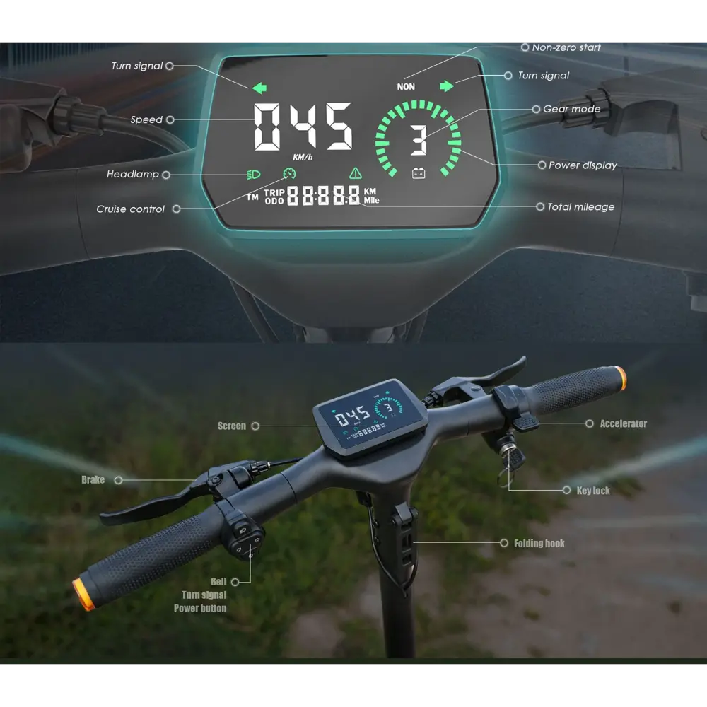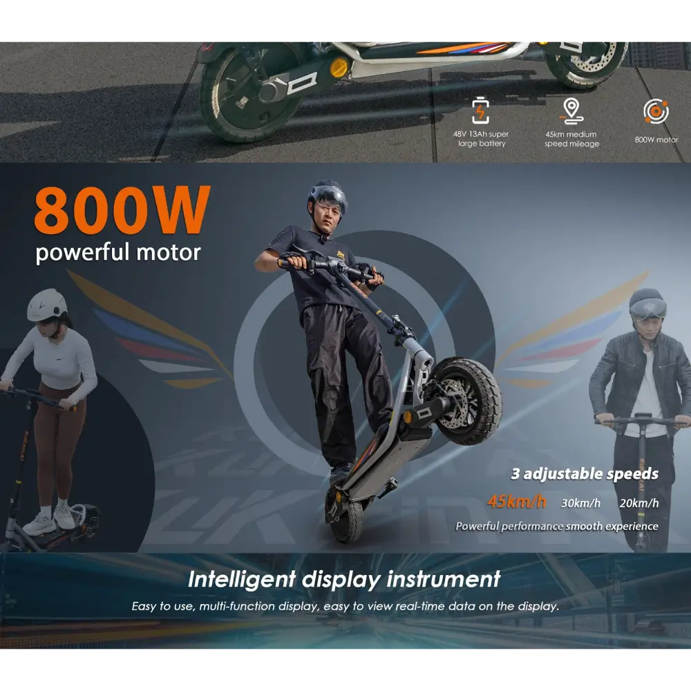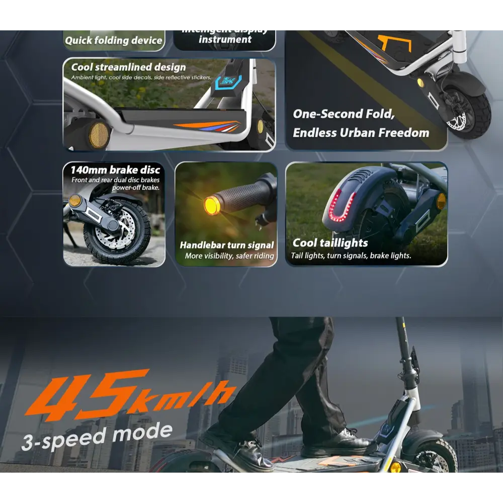 - Modes de vitesse : Trois options – 20 km/h, 30 km/h et 45 km/h