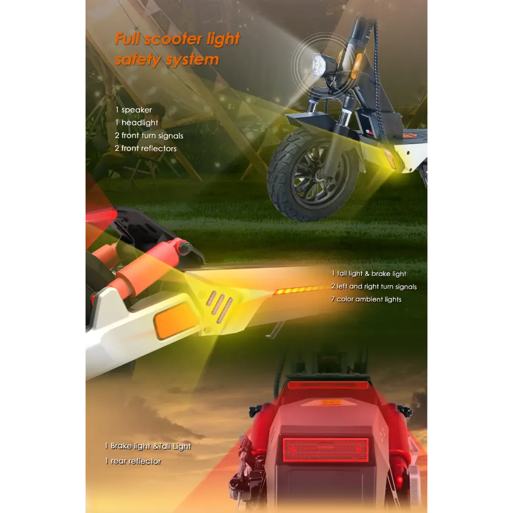 - Système d’éclairage : phare à faisceau large, feu stop, clignotants et éclairage d’ambiance à 7 couleurs