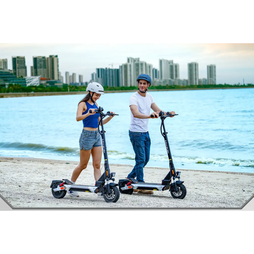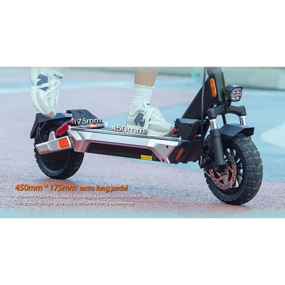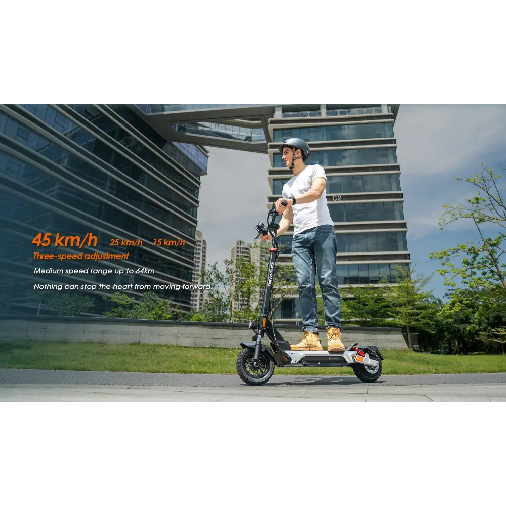 La KuKirin M4 Max Trottinette Electrique est un véhicule hautes performances conçu pour les déplacements urbains comme pour les aventuriers du week-end. Équipée d’un moteur sans balais de 800 W avec une puissance maximale de 1 000 W, elle atteint une vitesse de pointe de 45 km/h, idéale pour sillonner les rues de la ville ou gravir des pentes modérées jusqu’à 20°. Sa batterie lithium 48 V 18,2 Ah offre une autonomie impressionnante allant jusqu’à 64 km par charge, garantissant des trajets longue distance sans recharges fréquentes. Elle est équipée de pneus tubeless de 10 pouces offrant une excellente adhérence et une excellente absorption des chocs, ainsi que d’une suspension à quatre bras et de doubles freins à disque pour plus de sécurité et de confort. Selon vos besoins, vous pouvez choisir entre trois modes de vitesse : 15 km/h, 25 km/h et 45 km/h. Un mécanisme de pliage rapide avec verrouillage de sécurité facilite le transport, tandis que le pédalier spacieux et le tableau de bord intuitif offrent une expérience fluide et intuitive. Dotée d’un éclairage d’ambiance, de clignotants et d’un phare à faisceau large, la KuKirin M4 Max assure visibilité et style, de jour comme de nuit.