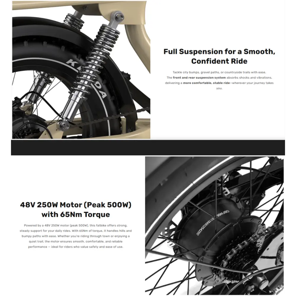 - Moteur : moteur de moyeu arrière 48 V 250 W (puissance de crête 500 W), couple de 65 Nm