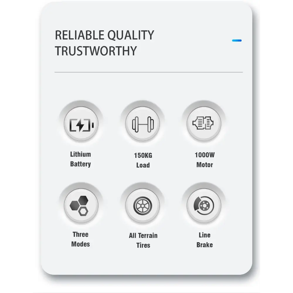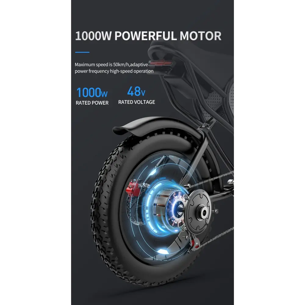 Le Ridstar Q20 Vélo Electrique Tout-Terrain est un vélo électrique robuste et performant, conçu pour les trajets urbains comme pour les aventures tout-terrain. Équipé d’un puissant moteur sans balais de 1000 W, il offre un couple et une accélération impressionnants, atteignant des vitesses allant jusqu’à 50 km/h. Sa batterie lithium 48 V 20 Ah offre une autonomie généreuse, jusqu’à 120 km en mode assistance au pédalage, ce qui le rend idéal pour les longs trajets. Doté d’un cadre en alliage d’aluminium robuste, le Q20 est équipé de pneus larges de 20 x 4 pouces offrant une excellente traction sur divers terrains, notamment la neige, le sable et les sentiers rocailleux. La transmission Shimano à 7 vitesses offre un contrôle flexible, et la double suspension (avant et arrière) garantit un confort de conduite optimal. La sécurité est renforcée par des freins à disque hydrauliques doubles, un éclairage LED et un écran LCD qui suit la vitesse, l’autonomie de la batterie et le kilométrage en temps réel. Avec son design élégant, sa selle large et confortable et ses multiples modes de conduite, notamment électrique pur, à assistance au pédalage et manuel, le Ridstar Q20 allie parfaitement puissance, style et praticité dans une conduite palpitante.
