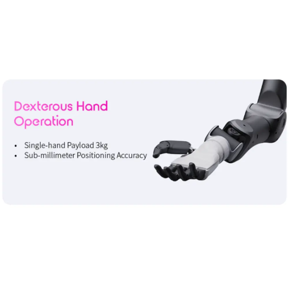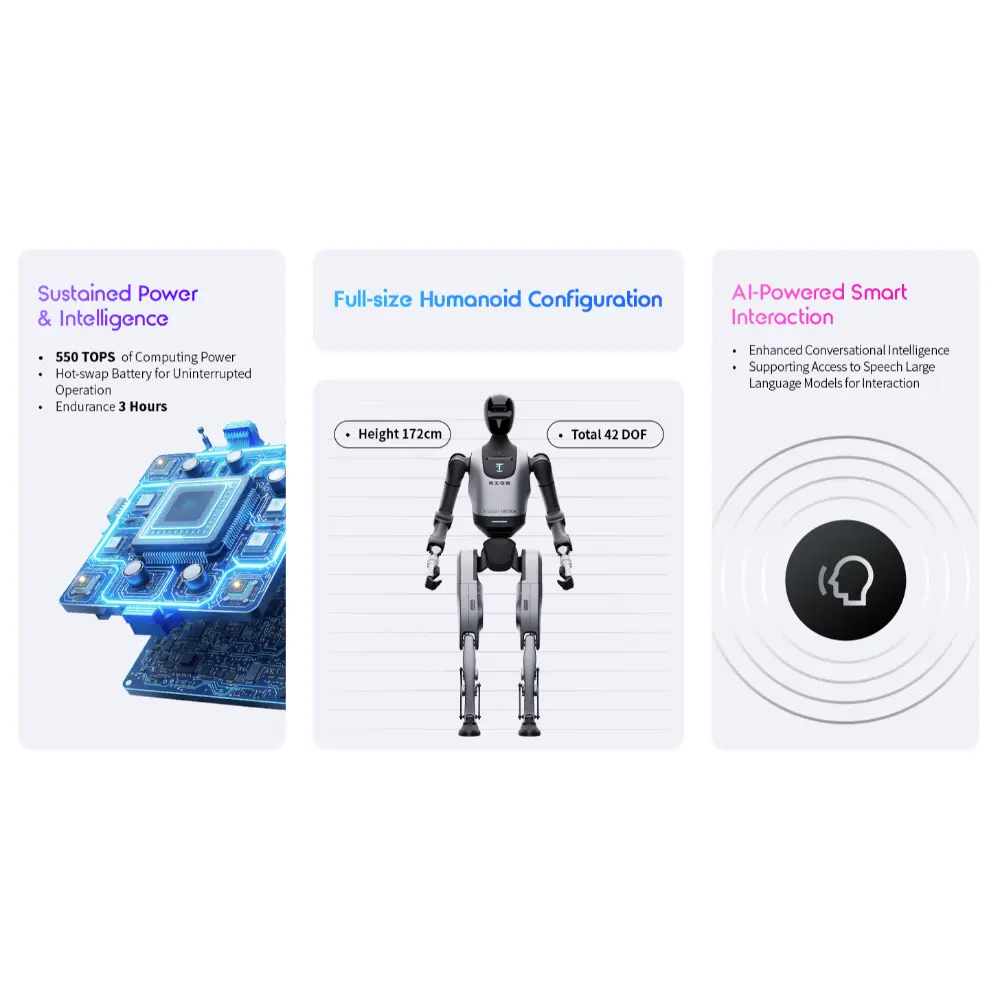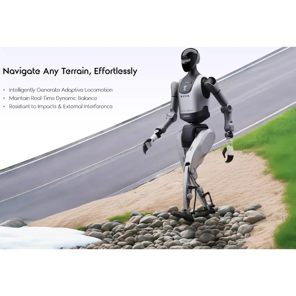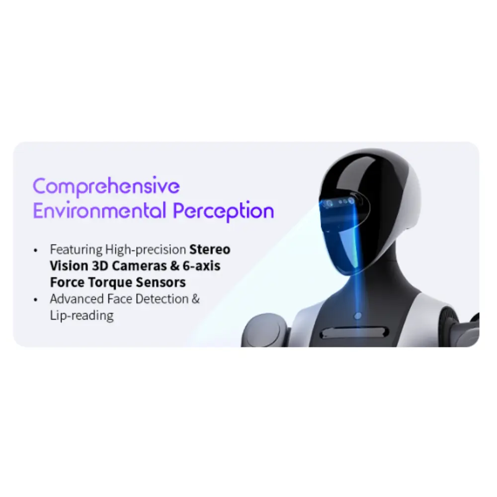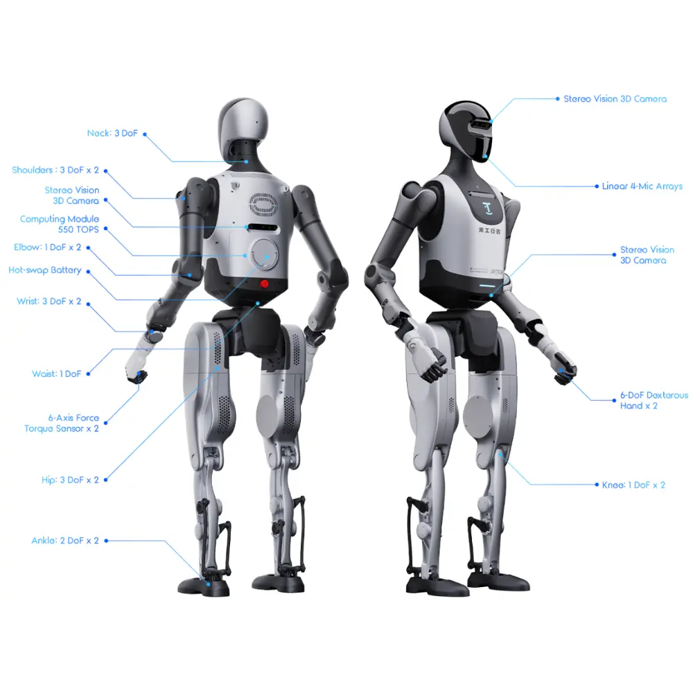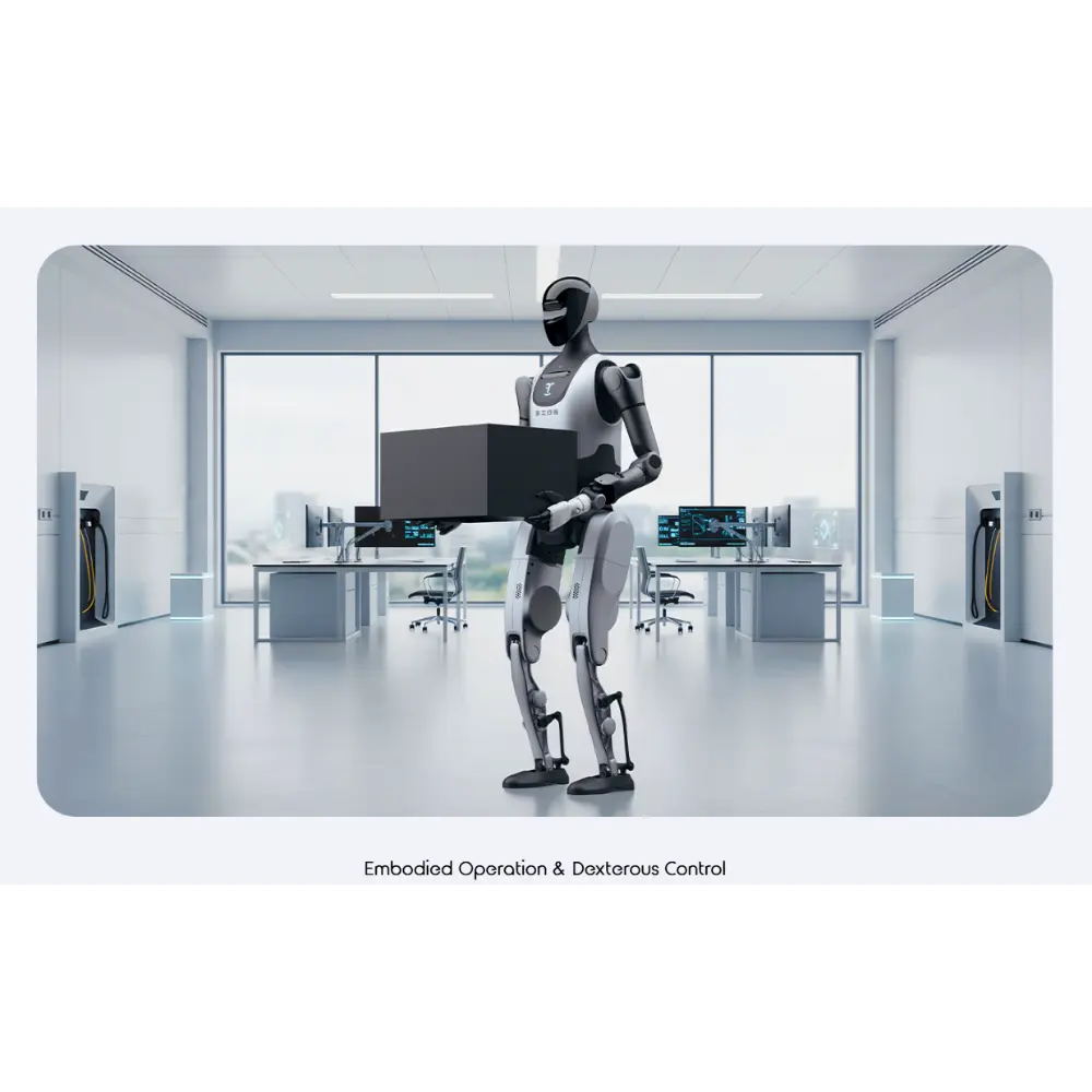 Le Robot Humanoïde Grandeur Nature à Intelligence Incarnée est un robot humanoïde hautes performances, de taille réelle, conçu pour la recherche avancée et les applications éducatives. De conception anthropomorphique, il mesure 172 cm de haut et dispose de 42 degrés de liberté (DDL), permettant des mouvements biomimétiques complexes, comme des sprints à des vitesses allant jusqu’à 10 km/h. Son châssis léger est fabriqué en alliages d’aluminium et de titane de qualité aérospatiale, intégrant des modules d’articulation exclusifs capables de fournir un couple maximal de 300 Nm. Le robot est alimenté par deux batteries remplaçables à chaud (30 Ah + 3 Ah), offrant jusqu’à 3 heures d’autonomie en mouvement continu et 6 à 8 heures en veille, grâce à un système de refroidissement par conduits d’air sur tout le corps. Ce robot excelle en perception et interaction multimodales, grâce à des caméras de profondeur, des capteurs de force à six axes et un kit vocal IA. Son cœur de calcul intègre une carte Orin 550 TOPS, permettant le traitement en temps réel de tâches telles que la coordination œil-main, la manipulation adroite et l’interaction avec de grands modèles. Il prend en charge les interfaces ouvertes compatibles ROS2 et offre une architecture modulaire avec des composants évolutifs, notamment des bras à 7 degrés de liberté et des mains à 6 degrés de liberté. Ce robot constitue une base solide pour la recherche sur l’intelligence incarnée et est idéal pour la recherche universitaire, la logistique industrielle et le secteur de la santé.
