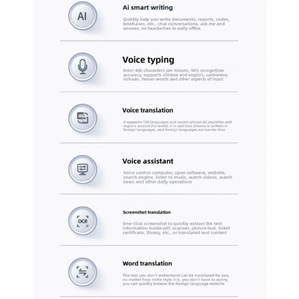 - Fonctionnalités vocales : saisie vocale IA, traduction en temps réel (prend en charge plus de 110 langues), commandes vocales et dictée, assistant de rédaction IA (courriel, contenu, résumés)