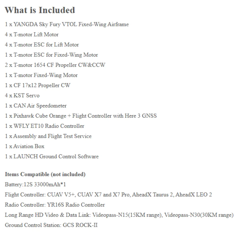 YANGDA Sky Fury Drone VTOL Longue Endurance – Specifications: